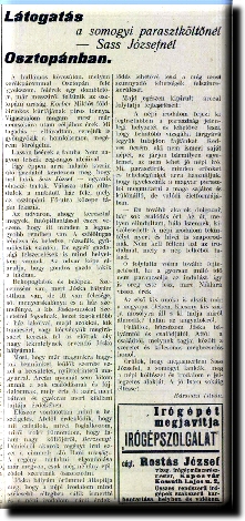 Sass József parasztköltő nem csak versírással foglalkozott, hanem szívügye volt a helyi történetek és népdalok gyűjtése. Könnyű dolga volt, hiszen a nép között élt, és egy-egy betyártörténet szereplőjét személyesen is ismerte. Néprajzgyűjtő munkája során megkeresték Budapestről is, többek között Muhorai Elemér és Bajor Nagy Ernő. Természetesen ennek nem igazán örült, ezt tanúsítja a költő saját írása:„Megértik - e, hogy nem elég egy betyárnótát, vagy egy népdalt meghallgatni, lejegyzetelni. Magát a termő helyét kellene megismerni először.”